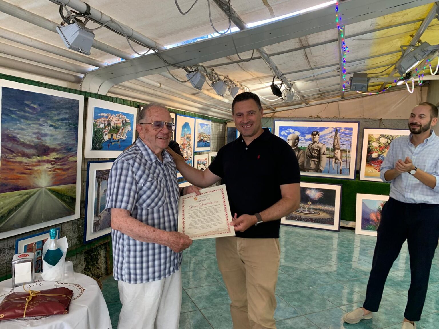 Il sindaco Cristian Leccese, accompagnato dal delegato alla Cultura Gennaro Romanelli, si è recato presso il locale espositivo ubicato lungo Cavour dell’artista gaetano, noto anche in ambito nazionale ed all’ estero, Gianni Guadalaxara, per la consegna di un encomio, tra l’altro nel giorno in cui lo stesso pittore ha spento novanta candeline. Gianni Guadalaxara, di origine spagnola, è nato a Gaeta il 5 luglio del1934 ed ha ricevuto le prime nozioni d’arte da Saturno Bartolomei, capostipite della generazione dei pittori gaetani del ‘900. Dipinse il suo primo quadro per una zia all’età di nove anni. Nelle sue composizioni si rifà ad un linguaggio pittorico di tipo post-impressionista. Il dato sensibile viene completamente superato in una concezione del fare artistico complessa in cui gioca un ruolo fondamentale anche la stessa gestualità dell’artista. Noto in tutto il mondo per la sua pittura vitalistica e passionale, Guadalaxara rende la sua arte a portata di tutti, emerge infatti senza difficoltà l’anima dei suoi paesaggi e dei suoi soggetti: barche, case, fiori, personaggi particolari e l’immancabile mare. Il paesaggio è stato da sempre protagonista nella ricerca artistica, sia come ambientazione, come sfondo, ma anche come soggetto esso stesso.