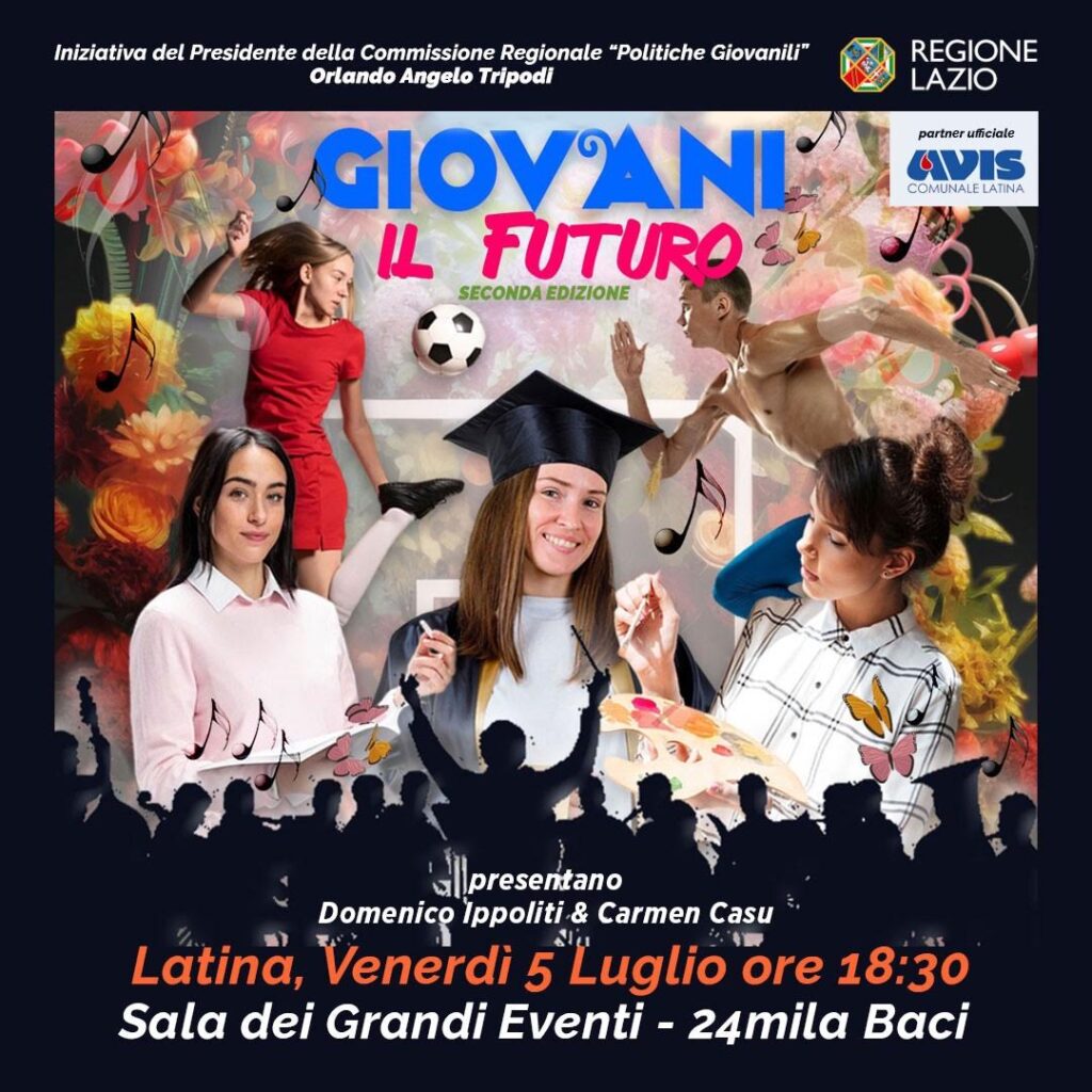 La “Sala Grandi Eventi” del 24mila Baci di Latina, in via dei Cappuccini, ospiterà venerdì 5 luglio, a partire dalle 18,30, la seconda edizione di “Giovani, il Futuro”. Si tratta di una ricca passerella riservata ai talenti che il capoluogo ed il territorio pontino hanno saputo esprimere nell’ultimo anno su svariati campi, dall’arte allo sport, dalla musica alla poesia, dal mondo del fumetto e dell’editoria alla sensibilità rivolta ai temi sociali. Tutto nasce da un’idea della poliedrica organizzatrice Carmen Casu e dal costante supporto fornito dal consigliere regionale Angelo Tripodi, presidente della commissione regionale “Politiche Giovanili”.