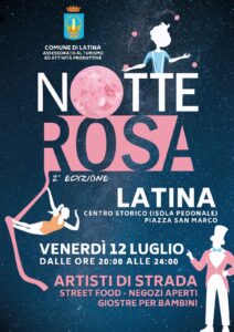 Il centro storico di Latina si tinge nuovamente di rosa per la seconda edizione della Notte Rosa. Venerdì 12 luglio, non solo per le vie del centro, ma anche a piazza San Marco e lungo tutto corso della Repubblica, i negozi resteranno aperti fino a mezzanotte per consentire uno shopping sfrenato anche grazie ai saldi appena iniziati. A regalare sorrisi e tanto divertimento a grandi e soprattutto bambini sono previsti 8 artisti di strada di fama nazionale per 16 eventi no stop lungo le vie della città. Sono 8, infatti, le postazioni fisse dislocate tra piazza San Marco, corso della Repubblica e via E. Di Savoia che ospiteranno maghi, giocolieri, equilibristi, clown, burattini che dalle ore 20 alle ore 24 si esibiranno gratuitamente in un ricco programma.