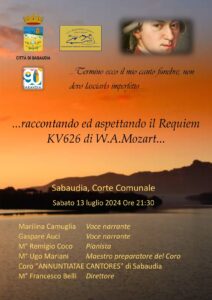 Il Coro Annuntiatae Cantores Città di Sabaudia, che nella sua trentennale esistenza ha già affrontato due volte lo studio e l’esecuzione del Requiem, sente nuovamente l’esigenza di confrontarsi con questa partitura sublime. I coristi si preparano a offrire al pubblico un’esperienza emozionante e indimenticabile. Il progetto artistico per l’estate di Sabaudia, voluto dall’Assessorato alla Cultura e Turismo, è patrocinato dell’Amministrazione comunale.