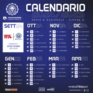 Inizierà in terra abruzzese la stagione 2024/2025 della Benacquista Assicurazioni Latina Basket, che domenica 29 settembre sarà ospite del Basket Chieti 1974 per la prima giornata del campionato nazionale di serie B. L’esordio in casa avverrà invece mercoledì 2 ottobre quando i ragazzi di Coach Origlio sfideranno la NPC Rieti di Coach Ponticiello per il primo turno infrasettimanale della stagione, cui seguirà, nuovamente tra le mura amiche, il secondo derby regionale (domenica 6 ottobre) contro la LUISS Roma di Coach Paccariè, anch’essa reduce dal campionato di serie A2.