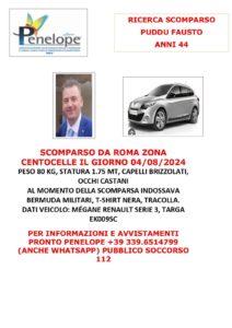Il 44enne normalmente guida una Renault Megane Serie 3 targata EK009SC. Per le sue ricerche si è attivata l’associazione Penelope Lazio Odv che ha lanciato una campagna sui social per cercare testimonianze o informazioni riguardo possibili avvistamenti di Fausto Puddu. Per la circostanza, è disponibile un numero di telefono al quale comunicare ogni informazione utile per il ritrovamento: 3396514799 o in alternativa rivolgersi al Numero Unico di Emergenza 112.