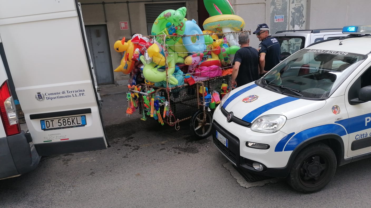 Proseguono i controlli intensificati della Polizia Locale sugli arenili di Terracina. Le attività di verifica si sono concentrate sul commercio abusivo in spiaggia. I controlli hanno riguardato in particolare gli arenili della spiaggia di ponente della Città. Le donne e gli uomini del Comandante Mauro Renzi nell’area di Badino hanno proceduto al sequestro di due carretti artigianali adibiti al trasporto di merce. Sequestrati anche numerosi articoli da mare, tra gonfiabili e giocattoli. I controlli sulle spiagge proseguiranno durante tutta la stagione estiva.