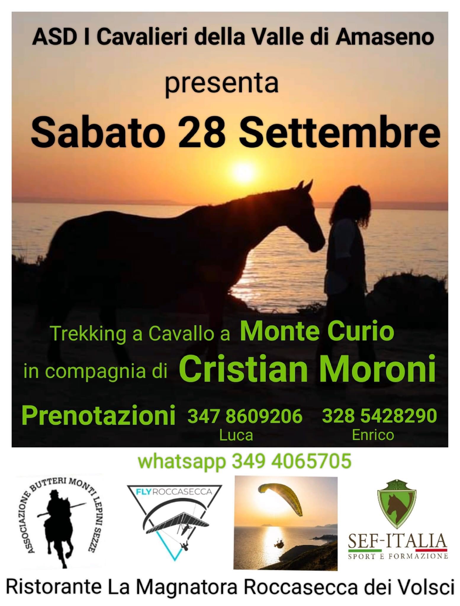 Il Trekking partirà alle ore 9:00 dal Campo Sportivo di Amaseno. Percorrendo antichi sentieri e mulattiere perfettamente percorribili, i cavalieri entreranno in provincia di Latina, precisamente a Roccasecca dei Volsci, dove si effettuerà una sosta presso il ristorante “La Magnatora”; poi si ripartirà alla volta del Belvedere di Monte Curio, per osservare il panorama che