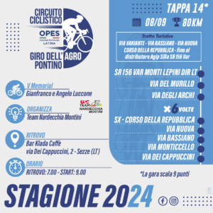 Dopo la pausa estiva riprende il “Giro dell’Agro Pontino” Opes, con la quattordicesima tappa di calendario in programma per domenica 8 settembre 2024. Sotto l’organizzazione del Team Nardecchia Montini è in arrivo a Sezze il 5° Memorial Gianfranco e Angelo Luccone in avvio alle ore 9.