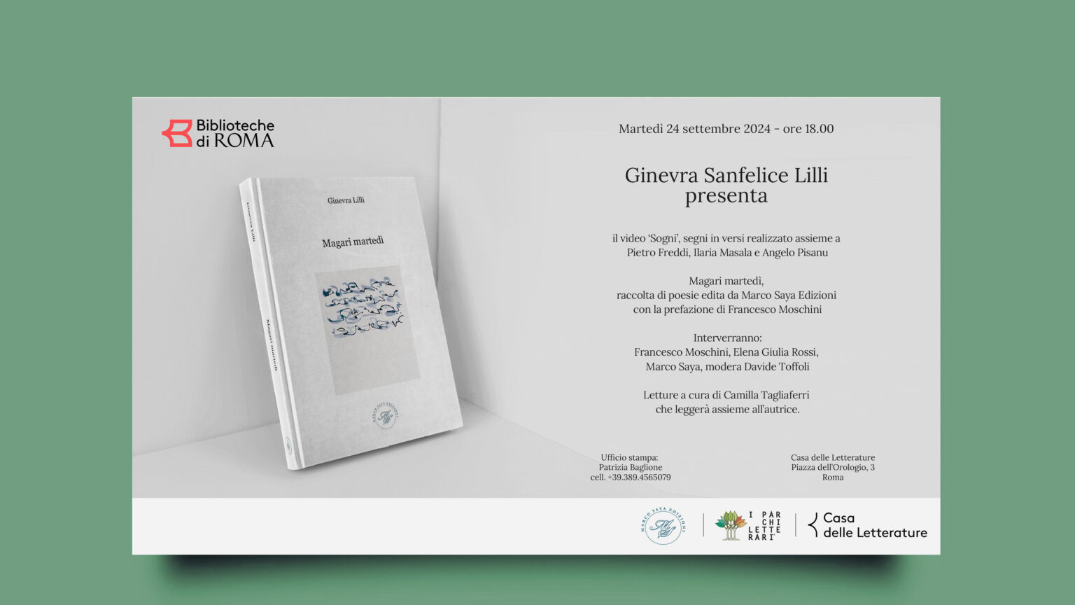 Il prossimo martedì, alle ore 18.00, si terrà presso la Biblioteca Casa delle Letterature di Roma, la presentazione di un doppio progetto, uno visivo e il secondo editoriale entrambi di Ginevra Sanfelice Lilli. Il primo intitolato ‘Sogni’ è un video in cui Ginevra Sanfelice Lilli con il contributo di Pietro Freddi ha messo in dialogo quindici disegni con quindici brani poetici tradotti dall’italiano alla lingua sarda da Ilaria Masala e Angelo Pisanu. Interverranno Francesco Moschini, Elena Giulia Rossi, Marco Saya, modererà Davide Toffoli. Letture a cura di Camilla Tagliaferri che leggerà assieme all’autrice.