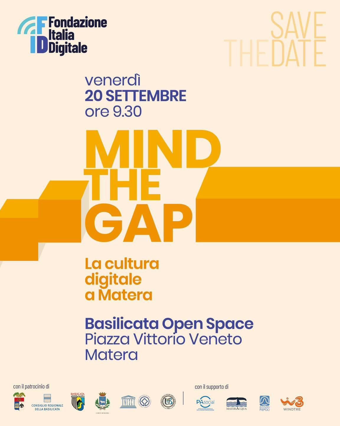 Fissate questa data in calendario: venerdì 20 settembre. Manca ormai pochissimo alla nuova edizione di Mind The Gap-la cultura digitale. Dopo il successo dello scorso anno a Lecce, si ripete a Matera l’appuntamento dedicato alla valorizzazione del territorio attraverso lo sviluppo della rete e delle nuove opportunità di lavoro ad essa connesse. Stesso format ma tante novità, a partire dalla location, ma non solo. Tanti gli ospiti di un evento imperdibile, organizzato da Fondazione Italia Digitale con il supporto di WINDTRE, dell’associazione MaterACqua, dell’associazione PA Social e dell’Istituto Piepoli e il patrocinio del Comune di Matera, della Provincia di Matera, della Regione Basilicata e di Apt Basilicata.