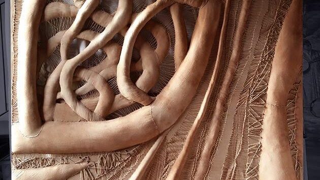 IL COMMENTO DELL’ARTISTA – “La mia ricerca formale si svolge nell’ambito dell’Astrazione Organica biomorfa e della Fiber art – dichiara Patrizia Trevisi – Indago il corpo come strumento d’esperienza. Lo scavo per scoprirne le connessioni, i legami, i nodi che mi possano portare al suo centro vitale, generativo. La tela è una pelle che cucio, annodo, ferisco. Gli squarci, le ferite sono tenute forzosamente aperte da pinze, cuciture, legacci, come su un tavolo operatorio. Mostrano agli sguardi indagatori le viscere, il Dentro, il contenuto nascosto, il loro mistero. La consunzione del colore, arcaico e primitivo, gli infiniti legami, le connessioni, il loro continuo intersecarsi, ci narrano il trascorrere del tempo che continuamente tesse la trama organica dell’essere”.