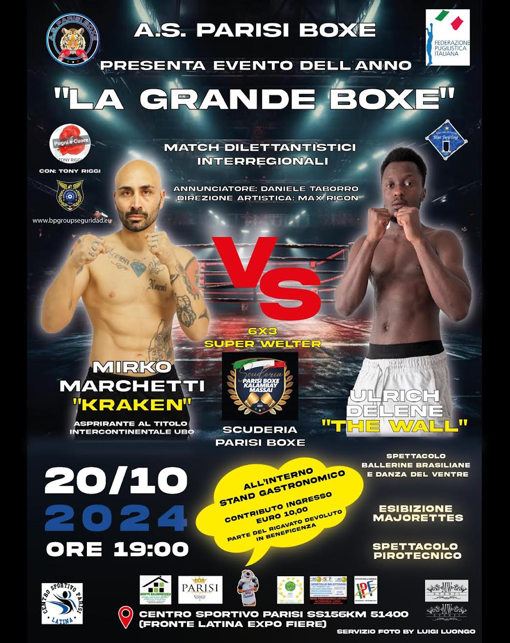 Organizzata da A.S. Parisi Boxe, la manifestazione avrà come main event uno scontro imperdibile tra i professionisti nella categoria Super Welter 6×3 tra Mirko Marchetti, “Kraken”, aspirante al titolo intercontinentale UBO e alfiere della Scuderia Parisi Boxe, e Ulrich Delene, meglio conosciuto come “The Wall”.