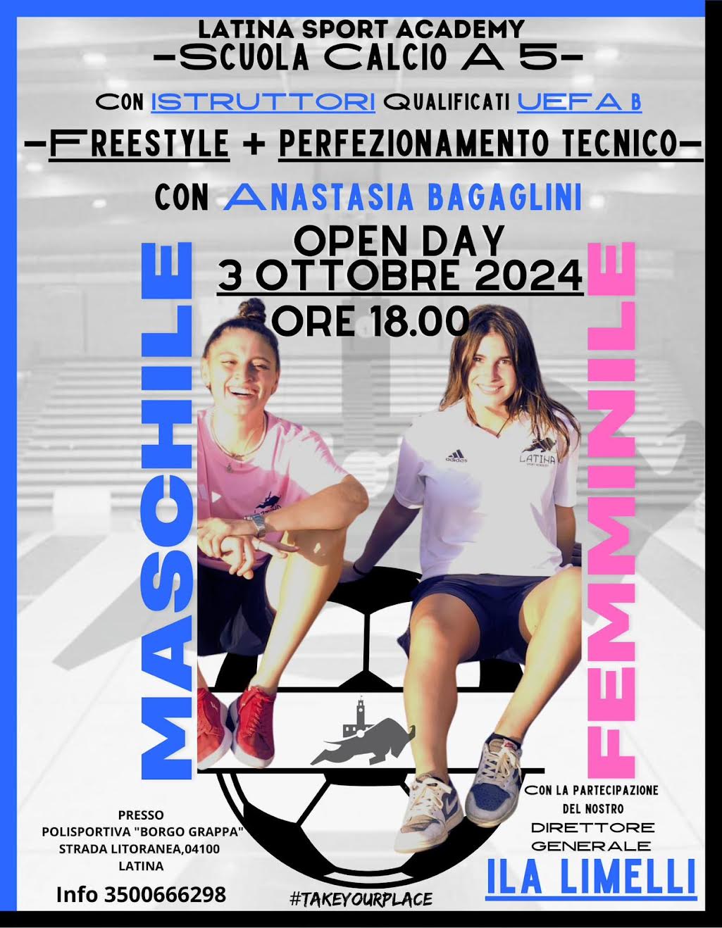L’atleta/calciatrice/acrobata di Latina, recentemente piazzatasi al primo posto assoluto nel “RedBull Street Style Championship” svoltosi in Kenya, spiegherà tutti i movimenti più spettacolari e tutti i trucchi del mestiere agli aspiranti suoi eredi di tutte le età. Tutto questo sarà proposto in un divertente e coinvolgente “Open Day” giovedì 3 ottobre alle 18 nella tensostruttura della Polisportiva Borgo Grappa, sulla Strada Litoranea, a Borgo Grappa. Ospiti dell’evento Ila Limelli, la direttrice generale del Latina Sport Academy nonché popolarissima youtuber. Per informazioni e prenotazioni contattare il numero 350.066.6298.