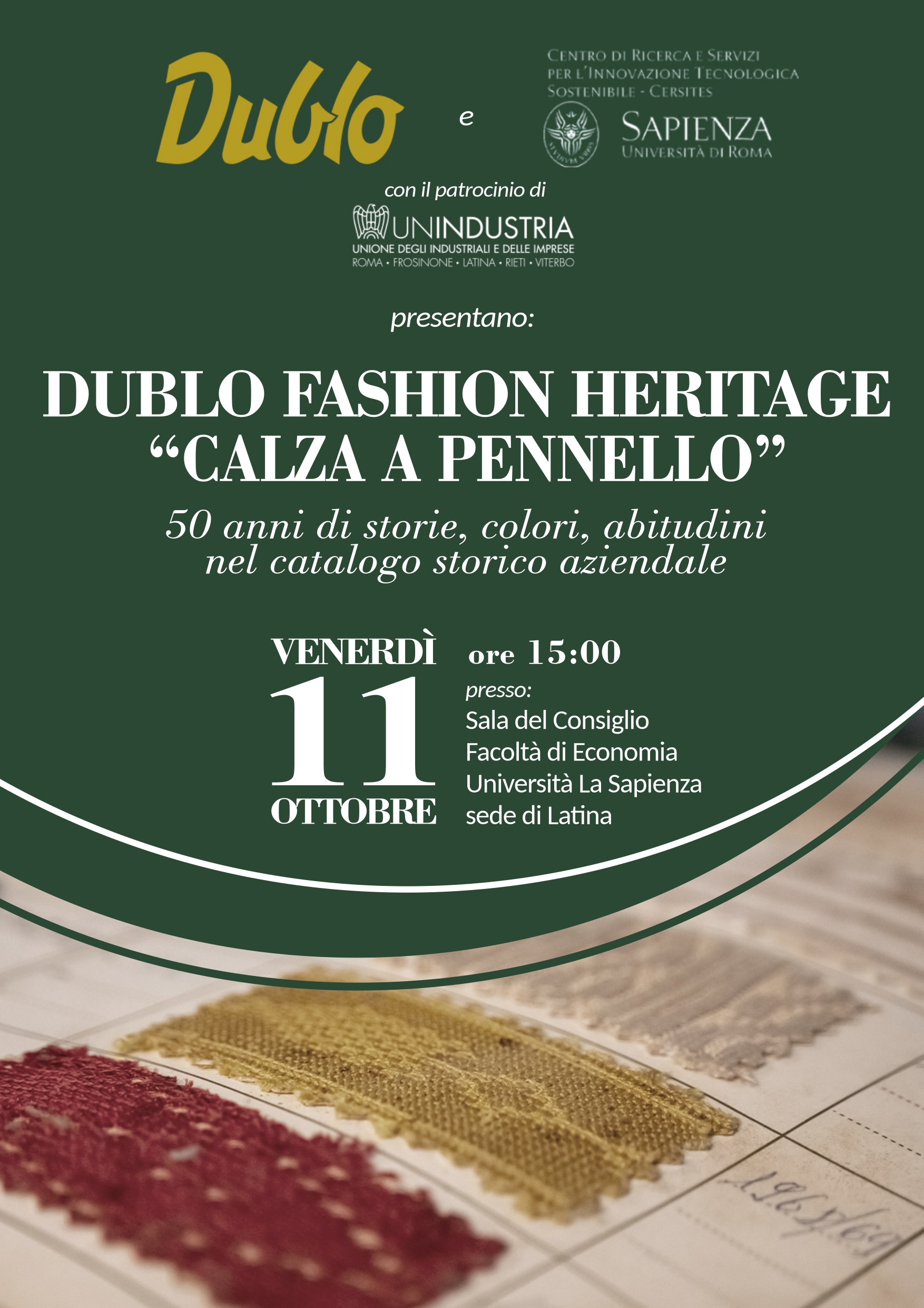 La storica azienda tessile Dublo srl, celebre per la produzione di calze da uomo di altissima qualità, celebra quest’anno i suoi 50 anni di attività con il progetto “Calza a pennello”, un’iniziativa che punta a valorizzare la storia, i valori e l’identità aziendale. Un progetto nato in collaborazione con l’Università La Sapienza di Roma e con il patrocinio di Unindustria Latina, che si propone di dare visibilità al prezioso Archivio Storico Aziendale attraverso la catalogazionee la digitalizzazione dei campionari di calzetteria prodotti nel corso degli anni.