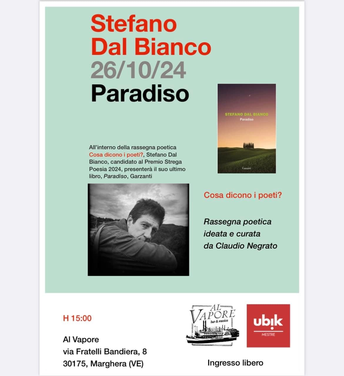Per il prossimo appuntamento della rassegna “Cosa dicono i poeti?”, ideata e curata da Claudio Negrato, sarà presente un ospite d’eccezione: Stefano Dal Bianco, vincitore del Premio Strega Poesia 2024 che presenterà “Paradiso” (Garzanti, 2024). L’evento si svolgerà sabato 26 ottobre alle ore 15 presso “Al Vapore – Bar e Musica” di Marghera.