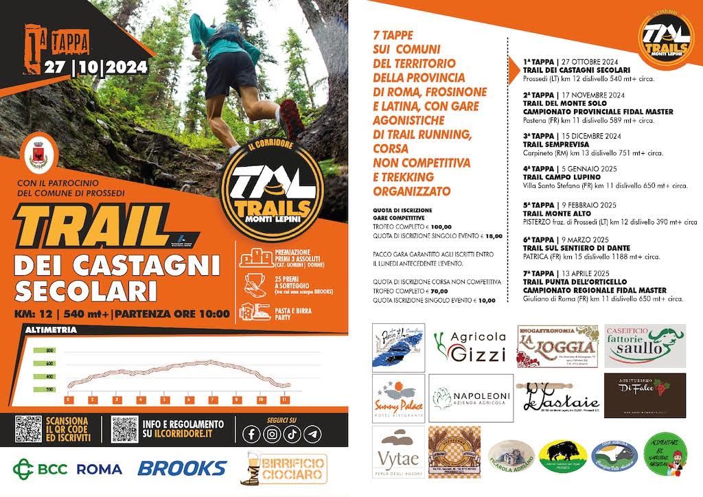 Il Trail dei Castagni Secolari, giunto alla sua terza edizione, è ormai un evento consolidato nel panorama sportivo locale. La gara, che prevede un dislivello totale di 540 metri, fa parte di un circuito di sette tappe che si svolgono nei comuni delle province di Roma, Frosinone e Latina, offrendo ai partecipanti la possibilità di scegliere tra competizione agonistica, corsa non competitiva e trekking guidato. La manifestazione è attesa non solo dai residenti di Prossedi ma anche da molti atleti provenienti da tutta la regione Lazio.