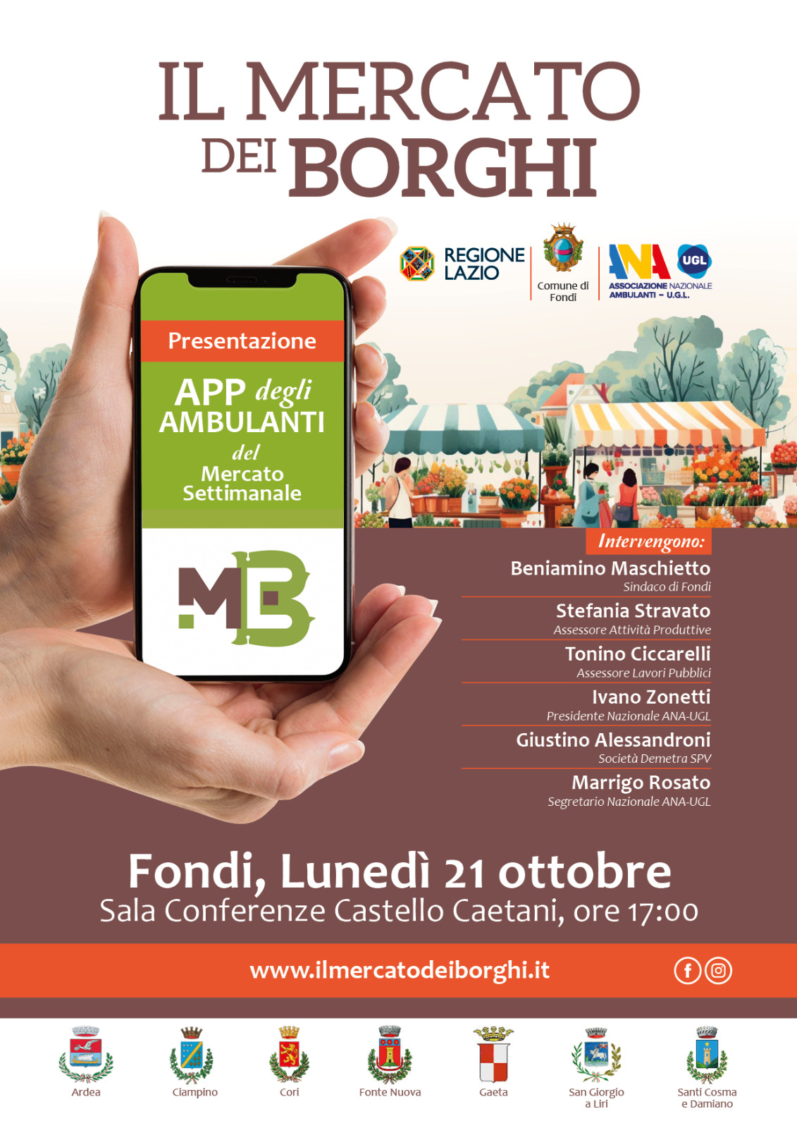 L’appuntamento è per lunedì 21 ottobre alle ore 17:00 presso la sala conferenze del Castello Caetani. Saranno presenti, oltre al sindaco di Fondi Beniamino Maschietto e agli assessori alle Attività Produttive Stefania Stravato e Antonio Ciccarelli che hanno coordinato il progetto ognuno per le proprie competenze, anche i rappresentanti degli altri Comuni aderenti. Ivano Zonetti e Marrigo Rosato, rispettivamente presidente e segretario nazionale dell’ANA UGL illustreranno il progetto nel suo insieme mentre Giustino Alessandroni della società Demetra SPV approfondirà gli aspetti digitali. Durante l’incontro saranno infatti presentati il sito web del “Mercato dei borghi”, una app per la scelta e l’acquisto dei prodotti con un sistema di pagamento intuitivo e sicuro, la campagna di comunicazione che interesserà social e testate giornalistiche ma anche le migliorie infrastrutturali apportate. Grazie ad un finanziamento regionale di 200mila euro, l’area di via Mola di Santa Maria è stata infatti dotata di illuminazione interna e nelle strade limitrofe e di un impianto elettrico per garantire il mantenimento della catena del freddo nel reparto agroalimentare. Non solo: sono stati identificati gli ingressi con grandi insegne luminose e, con un finanziamento comunale, sono stati completamente rimessi a nuovo i servizi igienici.