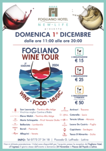 Dopo il grande successo della prima edizione il Fogliano Hotel New Life con le sue 5 incantevoli location, è pronto ad essere il cuore di un evento imperdibile e tanto atteso: la seconda edizione del Fogliano Wine Tour è pronta a far degustare i migliori vini abbinati ad un giusto equilibrio culinario. Domenica 1° dicembre dalle 11,00 alle 20,00, una giornata da trascorrere sul mare d’inverno, degustando vini delle varie regioni italiane, abbinati ai piatti e alle eccellenze del territorio. Sono questi gli attraenti ingredienti che caratterizzano questa seconda edizione del “Fogliano Wine Tour”, una suggestiva giornata da vivere dalla mattina fino al tramonto, in uno degli angoli più belli del litorale pontino.