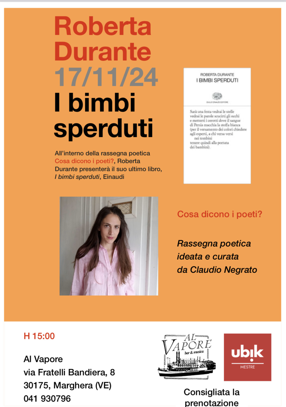 Domenica 17 novembre alle ore 15 si terrà il prossimo appuntamento della rassegna “Cosa dicono i poeti?”- ideata e curata da Claudio Negrato che vedrà la presenza di Roberta Durante, autrice del libro ‘I bimbi sperduti’ (Einaudi, 2023) presso “Al Vapore Bar e Musica” in Via Fratelli Bandiera, 8 a Marghera.