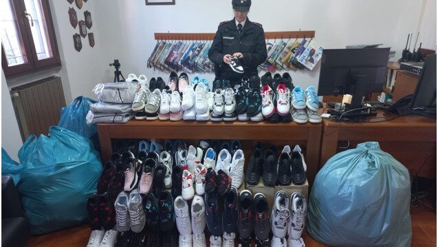 Nello specifico sono state rinvenute e posto sotto sequestro: 131 paia di scarpe con marchio presumibilmente contraffatto “NIKE”, 16 paia di scarpe con marchio presumibilmente contraffatto “ADIDAS”, 8 paia di scarpe con marchio presumibilmente contraffatto avente “ALEXANDER MCQUEEN”, 10 tute con marchio presumibilmente contraffatto “NIKE”. La merce sequestrata per un valore circa di 5.000,00 euro sarà custodita a disposizione dell’A.G. per le eventuali verifiche da svolgere depositata presso l’ufficio Corpi di reato del Tribunale di Latina.