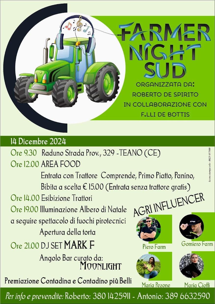 Si terrà a Teano, in provincia di Caserta, il primo evento dedicato agli agricoltori del Sud Italia, il “Farmer Night Sud”, un’occasione unica di svago e convivialità organizzata per il 14 dicembre 2024. Il programma dell’evento, pensato per celebrare la cultura agricola, prevede un’intera giornata di attività, a partire dal raduno mattutino fino alla serata festiva con musica e spettacoli pirotecnici.