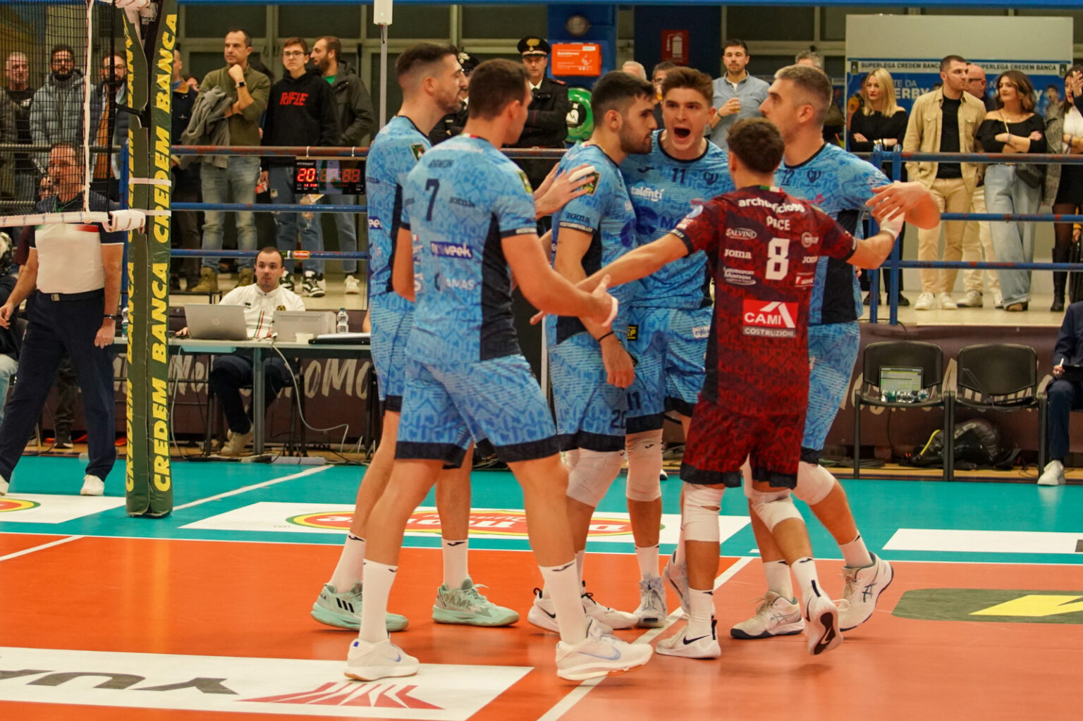 Coach Falasca conferma il sestetto delle ultime uscite. Baranowicz in regia con Theo Faure opposto, Nedeljkovic e Diamantini al centro, Bayram e Ramon schiacciatori con Pace a guidare la seconda linea. Grottazzolina ritrova Petkovic opposto a Zhukouski, al centro Demyanenko e Mattei, Antonov e Tatarov gli schiacciatori, con Marchisio libero. Il primo set sorride ai padroni di casa, bravi a partire subito forte nei primi scambi del match. Petkovic sigla il primo margine sul 7-4, con il Cisterna Volley a provare a restare in scia. Faure in parallela chiude l’azione dell’11-9, poi Baranowicz dai nove metri colpisce per il momentaneo 11-10. Demyanenko e Petkovic tengono avanti Grottazzolina. Nel finale Ramon prima in diagonale firma il 19-18, poi annulla due set point, prima che Antonov chiuda il primo parziale sul 25.21. Il Cisterna Volley riesce a cambiare il canovaccio della partita, passando subito avanti nel secondo set con la pipe di Jordi Ramon sul 2-7. Petkovic tiene a galla i padroni di casa, nma è Baranowicz, dai nove metri, a tenere a distanza Grottazzolina sul parziale di 8-12. Diamantini ferma a muro Demyanenko sul 12-17, gli fa eco Faure sul 14-20. Nel finale Ramon prima firma il set point sul 22-24, poi chiude il set con una bordata potente sul 23-25.