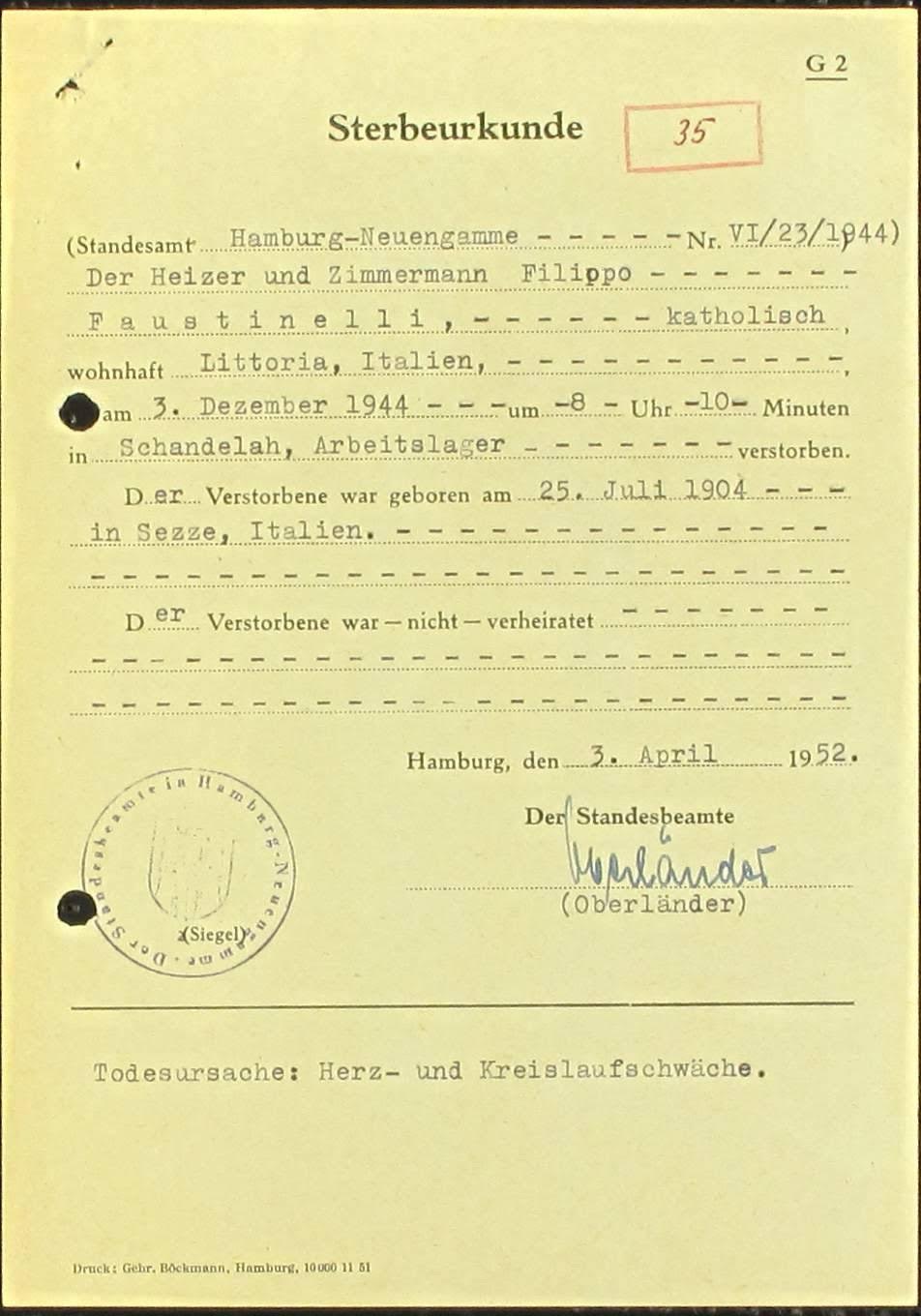 Ieri pomeriggio, ad Amburgo, si è svolta una cerimonia solenne per la posa di una pietra d’inciampo dedicata a Filippo Faustinelli, cittadino di Latina, deportato nel campo di concentramento di Neuengamme e morto nel dicembre del 1944. La posa della pietra d’inciampo è stata organizzata dalle comunità di Amburgo e di Cremlingen, oltre che dal Memoriale di Salzigtter, che continuano il suo impegno per tenere viva la memoria delle vittime del regime nazista.