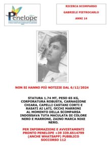 I familiari hanno diramato l’allarme con la foto del ragazzo nel tentativo di averlo a casa al più presto e hanno lasciato il numero telefonico dell’associazione Penelope (339 6514799) con l’invito a chiunque ne avesse notizia di segnalarlo a loro o alle forze dell’ordine attraverso il Numero Unico delle Emergenze 112.