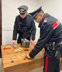 Nello specifico, l’indagato è stato sottoposto a perquisizione delegata dall’Autorità Giudiziaria, nel corso della quale i Carabinieri, nel vano porta oggetti del motociclo in uso all’indagato hanno rinvenuto un tira pugni e di 50 grammi circa di hashish, suddiviso in 11 dosi, nonché materiale vario per il confezionamento, un bilancino ed un taglierino.