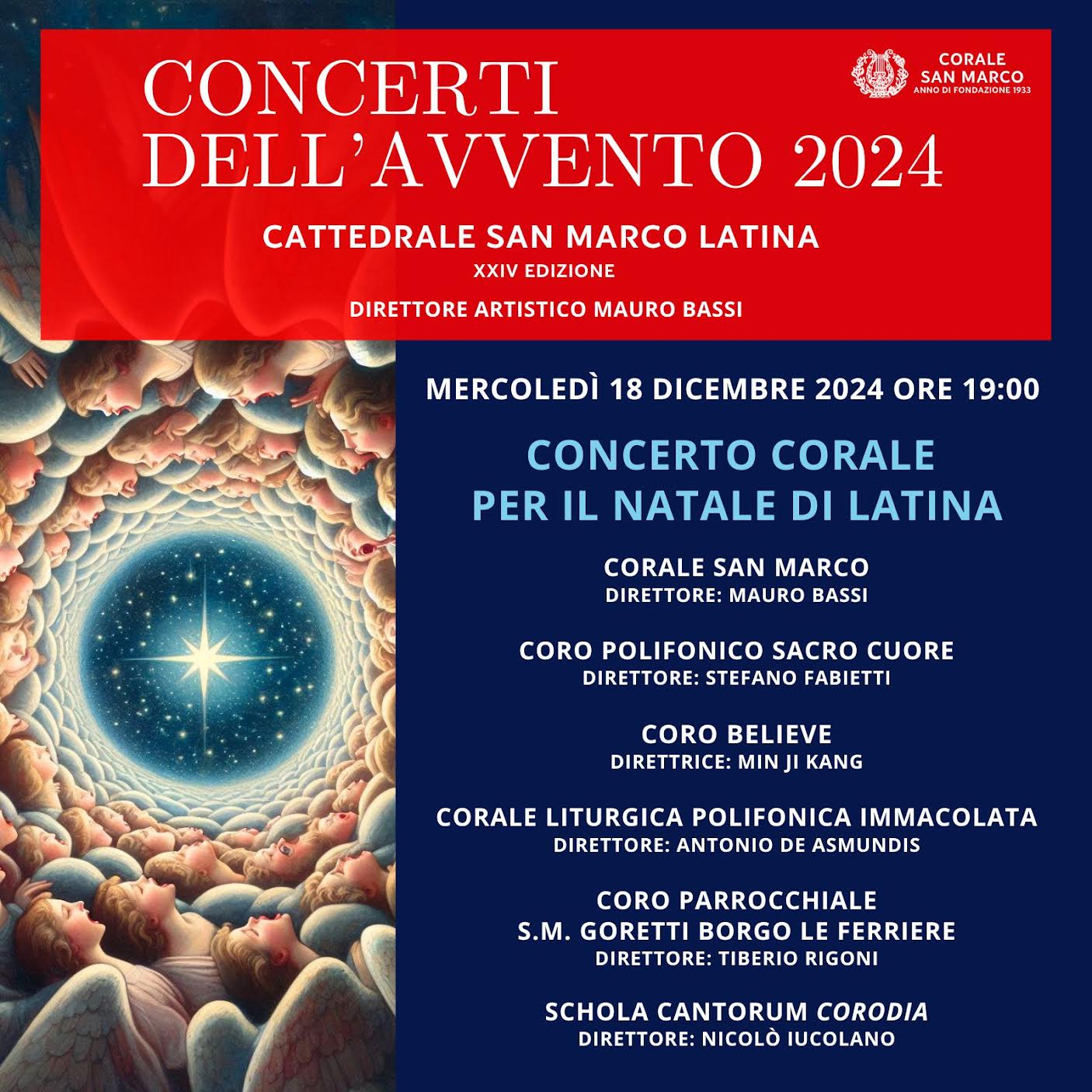 Il concerto del 18 dicembre vedrà esibirsi le seguenti corali: la Corale San Marco diretta dal M° Mauro Bassi, il Coro del Sacro Cuore diretto da Stefano Fabietti, la Corale BelievE diretta da Min Ji Kang, la Corale liturgica polifonica Immacolata diretta da Antonio De Asmundis, il Coro Santa Maria Goretti – Le Ferriere diretto da Tiberio Rigoni e La Schola Cantorum Corodia diretta da Nicolò Iucolano. Ogni corale presenterà alcuni brani del periodo di Avvento, per poi unire le voci in un grande coro che eseguirà un canto natalizio, simbolo di armonia e speranza.