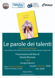 Quinto appuntamento con le “Le parole dei talenti”, la rassegna letteraria a cura di Marco Checchinato, Angelo Tozzi, Emilio Andreoli e Simona Fioroni che ogni giovedì ospita, alle ore 18 al Circolo Cittadino “Sante Palumbo” di Latina, autori della provincia pontina e non solo. Questa volta sarà il turno della scrittrice Gloria Perrone e del libro “Lilla”.
