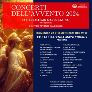 La rassegna I Concerti dell’Avvento è organizzata dall’Associazione Corale San Marco, sotto la direzione artistica del M° Mauro Bassi, direttore della Corale dal 2000. Si svolge per tutto il mese di dicembre nella Cattedrale, accompagnando il periodo dell’Avvento con cinque appuntamenti musicali che offrono l’opportunità di ascoltare interessanti realtà musicali del Lazio e di regioni limitrofe, in un’ottica di scambio e arricchimento culturale e relazionale.