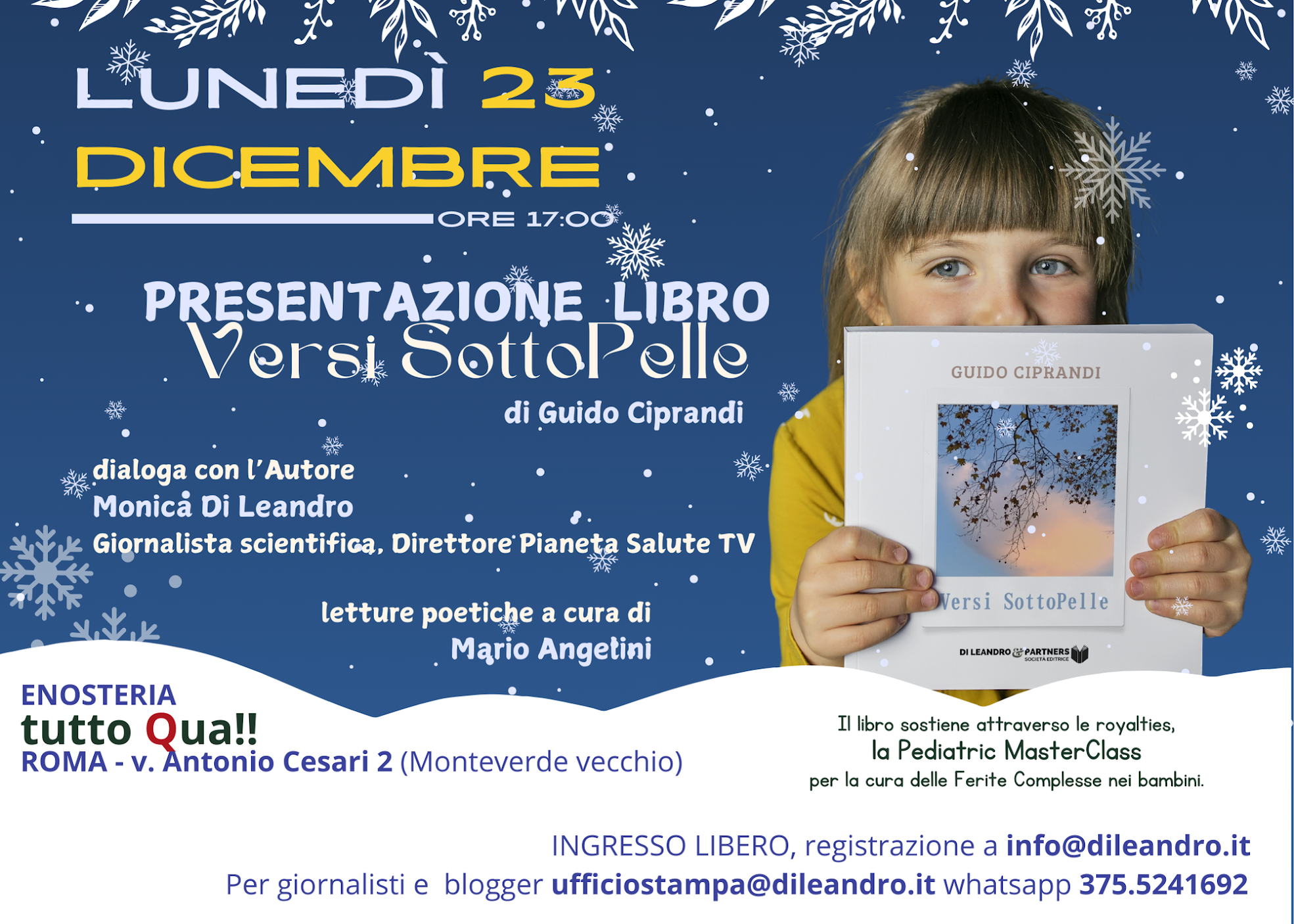 Lunedì 23 dicembre alle ore 17:00, presso l’EnOsteria TuttoQua, in via A. Cesari 2, si terrà un evento unico per gli amanti dell’arte e della cultura: il firmacopie del libro Versi SottoPelle di Guido Ciprandi, pubblicato da Edizioni Di Leandro.