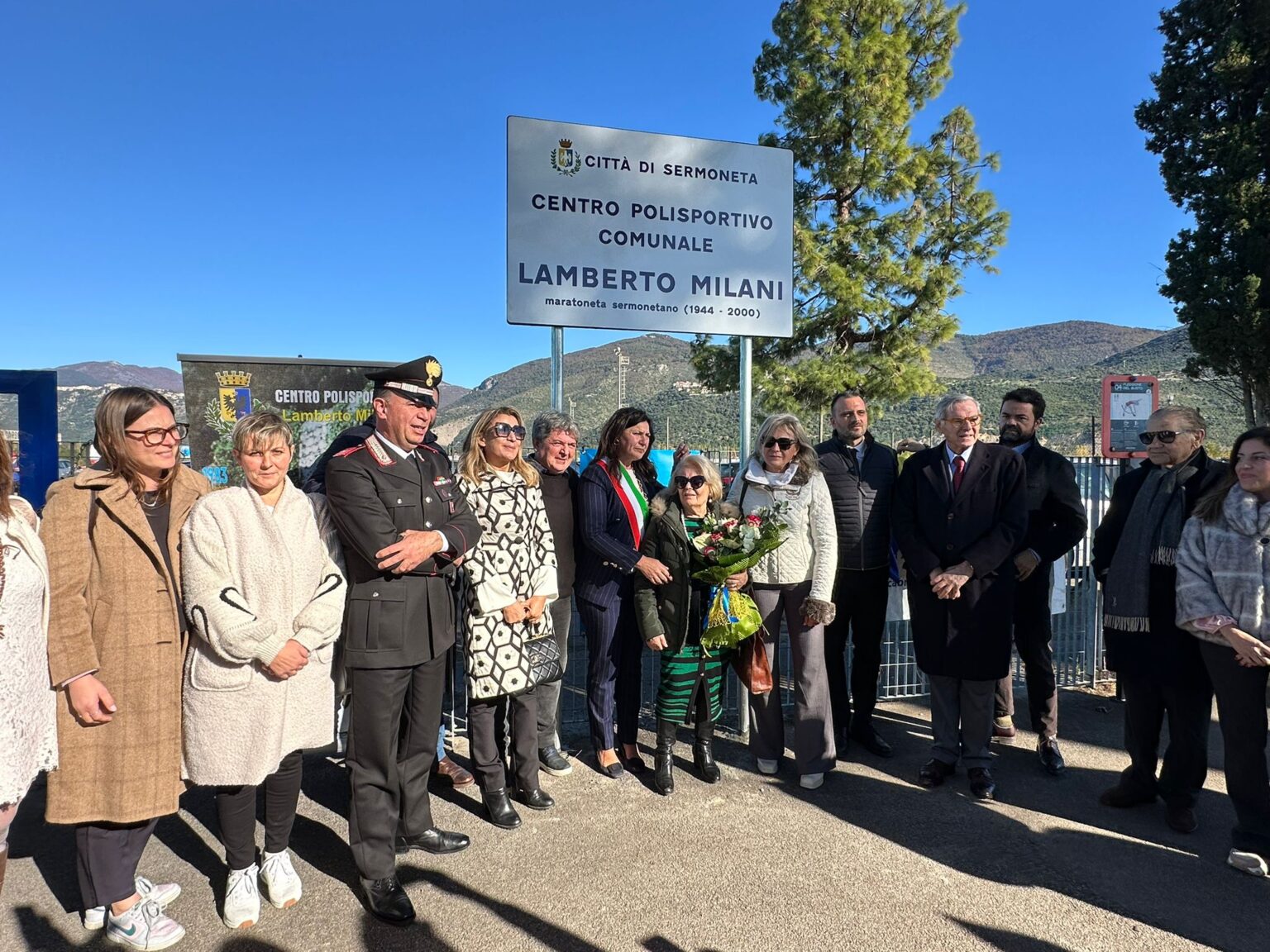 Il momento più emozionante è stato il ricordo di Lamberto Milani (1944-2000), un personaggio capace di raggiungere quattro record mondiali. Tra le sue imprese, il record del mondo Sermoneta-Padova-Milano del 1984, la corsa da Latina a Parigi nel 1985, 2300 km, impresa fino ad oggi mai eguagliata, ma anche il record del mondo del 1986 Palermo-Stelvio-Assisi, 4275 km. Toccanti anche le testimonianze del telecronista Umberto Paluzzi, che seguì le imprese di Milani, e dell’allora sindaco Luigi Torelli. A salutare la famiglia Milani, con la moglie Enza, i figli e i nipoti, è stato il sindaco Giuseppina Giovannoli, che insieme a tutta l’amministrazione ha fortemente voluto l’intitolazione, perché Lamberto Milani «è rimasto nel cuore della comunità con le sue imprese» e perché «Milani rappresenta un esempio di tenacia che deve essere da ispirazione per i più giovani». Al termine, è stata scoperta la targa all’esterno del centro sportivo e poi il taglio del nastro della pista di atletica, che ha dato il via alla mattinata di sport per bambini e ragazzi dai 5 ai 14 anni in collaborazione con l’Avis di Sermoneta. Alla giornata hanno partecipato, tra gli altri, anche l’ex sindaco di Latina Vincenzo Zaccheo, il comandante dei carabinieri Antonio Vicidomini, i rappresentanti delle associazioni locali, l’associazione nazionale carabinieri, la protezione civile, il centro anziani del centro storico con il presidente Dante De Santis, molti amici di Lamberto Milani, colleghi della Bristol e del mondo sportivo locale.