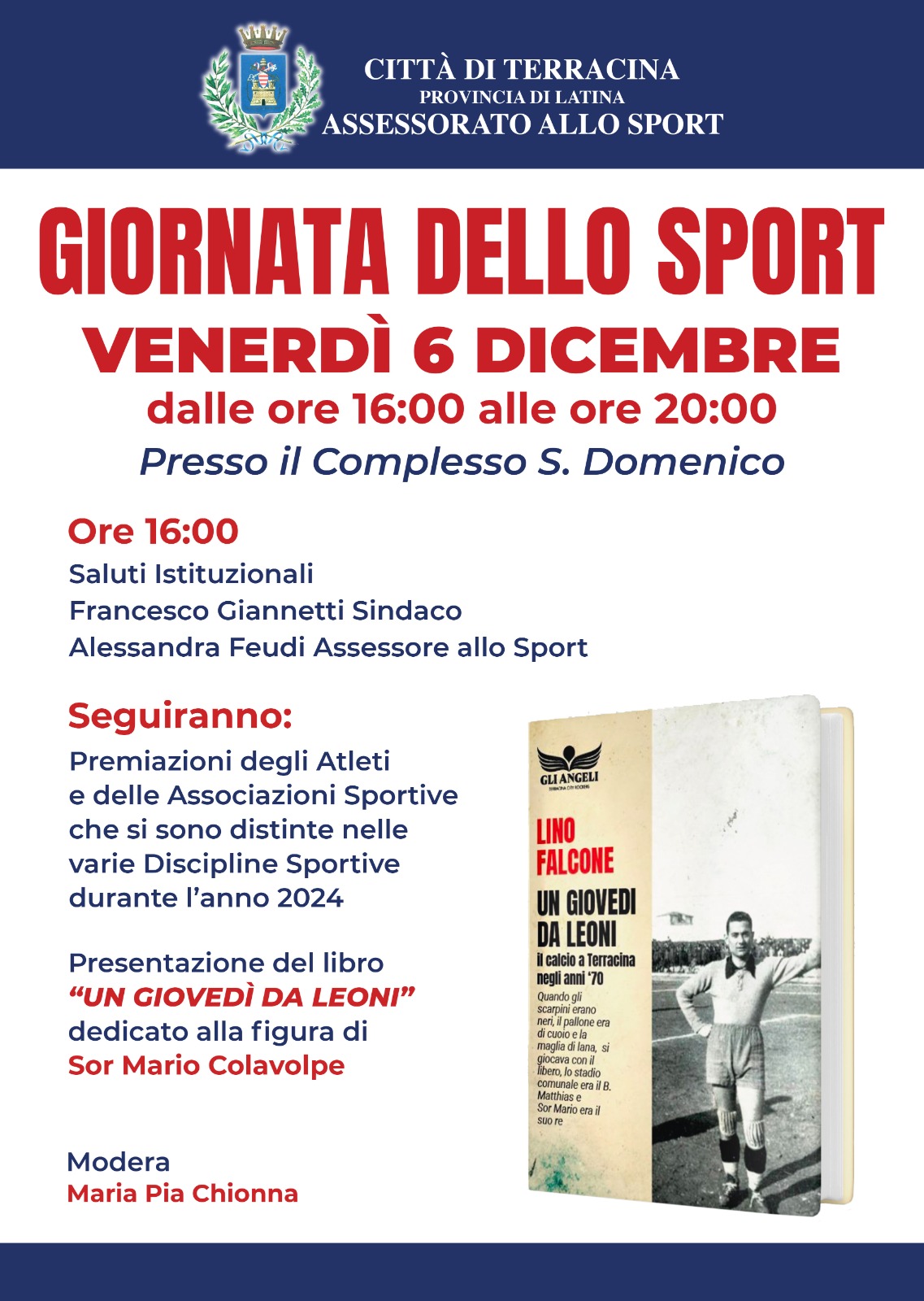 Terracina torna a celebrare lo sport con una giornata interamente dedicata a tutti gli atleti della Città e le Associazioni Sportive che si sono distinti nel corso del 2024. L’appuntamento con la prima edizione della Giornata dello Sport è per venerdì 6 dicembre alle ore 16:00 presso il complesso monumentale di San Domenico. Dopo la seconda edizione della Festa dello Sport che si è tenuta a settembre scorso presso il Parco della Pineta, un’occasione per far conoscere le eccellenze dello sport del territorio e al tempo stesso far avvicinare cittadini e sportivi a nuove discipline, adesso a quelle stesse eccellenze dello sport del territorio verrà conferito un riconoscimento. Un premio per l’impegno e la dedizione, e per i risultati raggiunti nelle diverse discipline. La Città di Terracina vanta infatti tantissimi atleti e campioni che si sono distinti nel panorama sportivo nazionale e anche internazionale con medaglie e titoli prestigiosi.