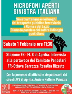 Nell’ambito della campagna nazionale di controinformazione di Sinistra Italiana denominata Sveglia Salvini, Sinistra Italiana Lazio denuncia i disagi e sostiene le legittime rivendicazioni del pendolarismo. Sabato 1 Febbraio dalle ore 11 alla stazione FL8 di Aprilia SI Lazio con l’iniziativa Microfoni Aperti, continuerà il suo percorso di interlocuzione e di studio intervistando la portavoce del Comitato FR Ottava Carrozza Rosalba Rizzuto. “In questo terzo appuntamento porremo tre domande sulle problematiche della tratta FL8 e sulle motivazioni del persistente disagio, per abbattere il muro di gomma preparato dalla indifferenza della giunta regionale Rocca e veicolato dalla propaganda di Meloni-Salvini, che vede chiodi nei quadri elettrici e sabotaggi inesistenti, ma non interviene mai preventivamente sui disservizi e sull’aumento indiscriminato delle tariffe.” Stefano Caroselli resp. trasporti – infrastrutture e mobilità sostenibile Sinistra Italiana Lazio.