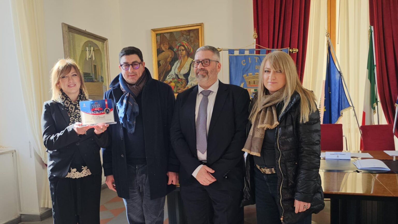 Sono stati premiati questa mattina i vincitori del concorso di idee denominato “Natale in vetrina”, l’iniziativa promossa dall’Amministrazione Comunale, guidata dal Sindaco Gianluca Taddeo, finalizzata a sostenere le attività commerciali e artigianali della città. Per i primi sei una targa ed un premio in denaro e per tutti gli altri partecipanti un attestato. Un riconoscimento ed un ringraziamento da parte dell’Amministrazione a tutti coloro che, dando libero sfogo alla creatività e fantasia, hanno contribuito a rendere magica l’atmosfera del Natale in città. Presenti in sala Sicurezza il Sindaco Gianluca Taddeo, l’Assessore alle Attività produttive Francesco Traversi, la Dirigente comunale Giuseppina Sciarra e l’Assessore alla Cultura Luigia Bonelli.