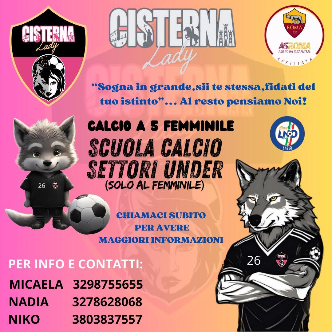 A partire da oggi, il settore giovanile diventa una realtà concreta, offrendo alle giovani di Cisterna un’opportunità unica di entrare a far parte di un progetto calcistico ambizioso. Un progetto che non solo mira a far crescere le grandi giocatrici di domani, ma anche a coinvolgere le nuove generazioni in un contesto di passione e divertimento, alla ricerca delle future “lupacchiotte” del calcio a 5.