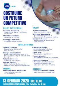 Si terrà il prossimo lunedì 13 gennaio alle ore 10.00, presso la sede di Latina Formazione Lavoro (Via Epitaffio, Km 4,200), l’evento dal titolo “Costruire un futuro competitivo”, organizzato da UGL Lazio.