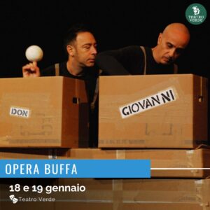 Sabato 18 gennaio 2025 alle ore 17, (con replica domenica 19, sempre alle ore 17) la Compagnia Teatro Verde porterà in scena OPERA BUFFA di Andrea Calabretta, Gianluigi Caponee Emanuele Avallone che ne cura anche la regia. In scena Andrea Calabretta e Gianluigi Capone. La direzione artistica è di Veronica Olmi.