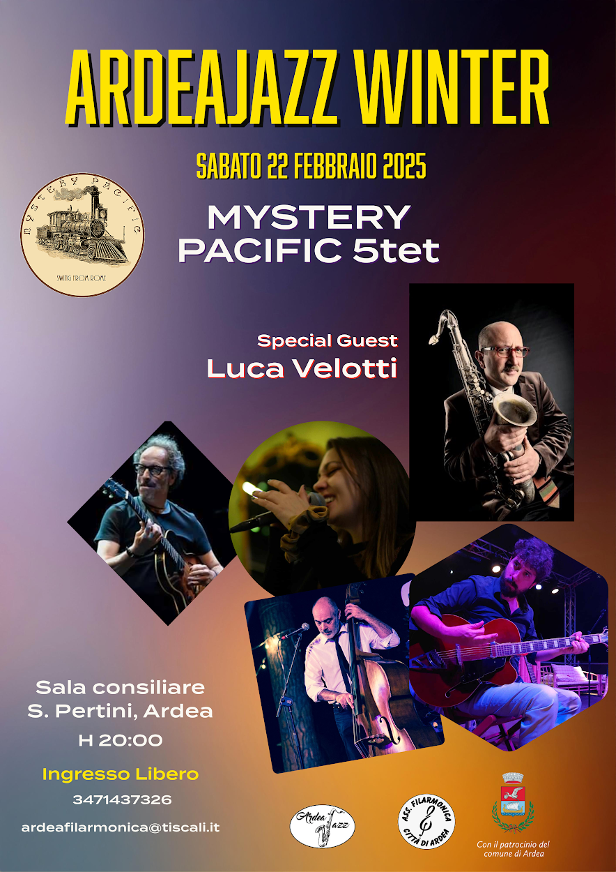 Ad esibirsi i Mystery Pacific, un quintetto Swing d’eccezione; special guest il Clarinettista e Sassofonista Luca Velotti e poi la suadente Voce di Valeria Piccolo e alla Chitarra Ritmica il frontman Francesco Pucci; alla Chitarra Solista il veterano del Jazz e dello Swing Alessandro Russo e al Contrabbasso Fabrizio Montemarano. Il vasto repertorio, che abbraccia due secoli di jazz manouche, fino ad arrivare alle più belle sonorità dello swing, attraversando il periodo che va dagli anni 20 agli anni 50 con energia e coinvolgimento è pronto a regalare, all’attento pubblico di Ardea, una serata indimenticabile.