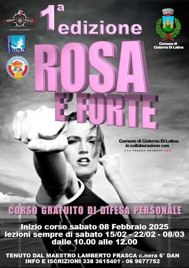 «È con orgoglio – sottolinea l’assessora allo sport del Comune di Cisterna Gaetana Capasso – che assistiamo al debutto della prima edizione di “ROSA è Forte”, un’iniziativa pensata per promuovere la sicurezza e l’autodifesa tra le donne della nostra comunità. Questo corso gratuito di difesa personale, tenuto dal Maestro Lamberto Frasca, offrirà un’opportunità per apprendere tecniche fondamentali che aumentano la consapevolezza e la sicurezza personale. Con quattro incontri dedicati le partecipanti potranno acquisire non solo abilità pratiche, ma anche un momento di empowerment che speriamo possa rendere ogni donna più forte e sicura di sé. Per noi – conclude – è una grande soddisfazione apprendere che questa iniziativa ha raccolto un numero di adesioni decisamente superiore alle aspettative».