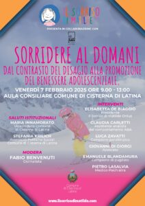 Venerdì 7 febbraio, dalle ore 9:00 alle 13:00, la sala consiliare del Comune di Cisterna di Latina ospiterà un nuovo appuntamento del progetto “Sorridere al domani. Dal contrasto del disagio alla promozione del benessere adolescenziale”. L’iniziativa, promossa da Il Sorriso di Matilde Onlus in collaborazione con la casa editrice Lab DFG, nasce dalla necessità di affrontare il disagio giovanile con interventi mirati e condivisi. Un fenomeno sempre più complesso che richiede un impegno concreto da parte di istituzioni, esperti e società civile. Protagonisti dell’incontro saranno gli studenti e le studentesse del Campus dei Licei “Ramadù”, che avranno l’opportunità di confrontarsi con esperti del settore e testimonial d’eccezione, tra cui campioni sportivi e paralimpici. L’evento rappresenta un’importante occasione di dialogo e sensibilizzazione, ponendo al centro il benessere psicologico e sociale delle nuove generazioni.
