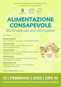 “Alimentazione consapevole. Scelte sane per una vita migliore”. Se ne parlerà sabato 15 febbraio alle ore 10 presso il Circolo Cittadino “S. Palumbo” di Latina, nell’ambito della giornata di informazione e sensibilizzazione promossa dai biologi nutrizionisti Salvatore Battisti, Cristina Funaro, Vanessa Pacelli, Federica Pesce e Davide Reccanello.