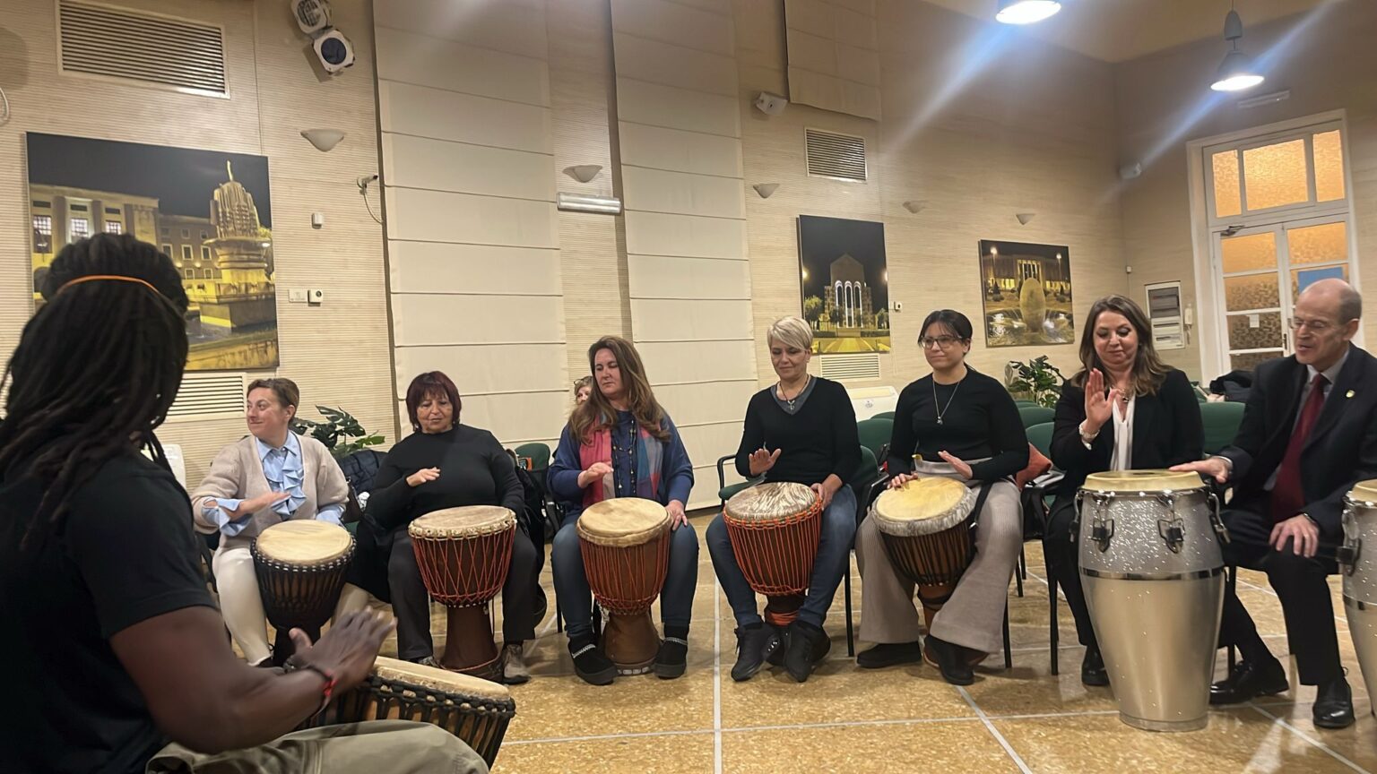 Nel corso della serata la giornalista e prof.ssa Maria Corsetti ha letto racconti tratti dal libro di Mediazione Sociale “Darifugiatiacittadini”, premio letterario 2023, indetto dal Comune di Latina in occasione della giornata mondiale del rifugiato. Una lettura commossa e partecipata che ha incantato il pubblico. La dottoressa Madalina Vasile dalla Romania ha creato un ponte da Timisoara a Latina con il Lions club hostdi Latina sull’importanza dell’alimentazione, in collaborazione con un luminare: il prof RobertoVolpe, medico internista del CNR. Il loro progetto “Healthyhearts on screen Lions project “consiste nel diffondere fra gli studenti delle scuole superiori e licei l’importanza di un’alimentazione corretta e il loro impegno sarà divulgarla e promuoverla attraverso un concorso: un cortometraggio prodotto dagli studenti sul tema della salute e la giusta alimentazione. La Prof.ssa Ilenia Tornesi ha riportato l’esperienza linguistica bilingue dei suoi parenti emigrati 50/60 anni fa, leggendo due poesie in lingua inglese e italiana della scrittrice italo canadese Gianna Patriarca emigrata da piccola con la sua famiglia. L’evento si è concluso con uno scoppiettante e coinvolgente workshop con ritmi senegalesi in compagnia del grande musicista e maestro di percussioni IsmailaMbaye, attore, storyteller d’eccellenza,che ha affrontato il tema forte legato agli scafisti e immigrati, fino a traghettarci ai tempi della tratta degli schiavi, nella sua bella Isola di Gorée che, ora meta turistica, con la sua ‘Casa degli Schiavi’, Patrimonio Mondiale dell’Unesco,rimasta legata ai ricordi e alla storia, per la deportazione degli schiavi.‘Porta del Viaggio senza Ritorno’.