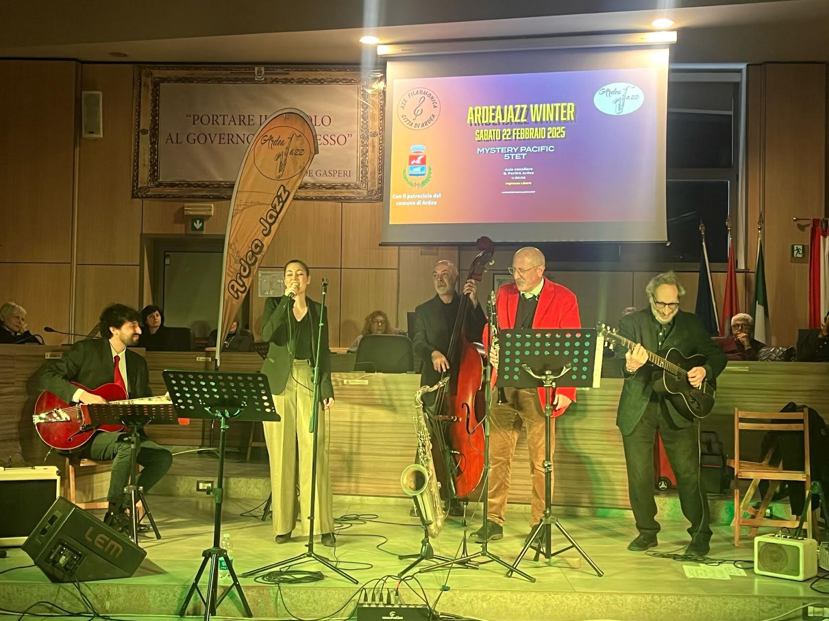 È stata una serata ricca di emozioni quella che ha visto protagonisti ad Ardea i Mystery Pacific 5tet. In una straripante sala consiliare l’eccezionale quintetto Swing che ha affidato la parte cantata alla suadente Voce di Valeria Piccolo, ha conquistato il pubblico per bravura e simpatia, si sono esibiti: alla Chitarra Ritmica il frontman Francesco Pucci; alla Chitarra Solista il veterano del Jazz e dello Swing Alessandro Russo, al Contrabbasso Fabrizio Montemarano e special guest il Clarinettista e Sassofonista Luca Velotti.