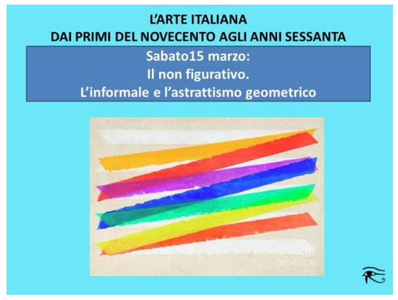 Sabato 15 marzo alle 18.30, presso la sala del Comitato di Quartiere Grattacielo, si terrà il nuovo appuntamento del ciclo “L’arte italiana dai primi del Novecento agli anni Sessanta”, organizzato dall’associazione “L’Occhio di Horus APS”. Oggetto dell’incontro è l’illustrazione dell’evoluzione verso il non figurativo, che approda ad un’arte astratta priva di ogni riferimento al mondo delle forme sensibili e che dirige la sua ricerca verso l’ambito dell’informale, inteso non come “informe”, cioè senza forma, ma come “non formale”, realizzando una pittura svincolata dai limiti progettuali e teorici del pensiero razionale.