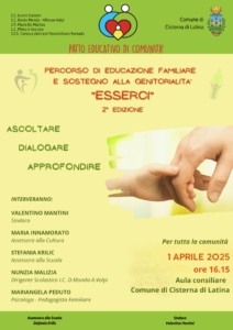 In occasione della seconda annualità del Patto educativo di comunità promosso dal Comune di Cisterna di Latina, l’Istituto comprensivo “Dante Monda-Alfonso Volpi” intende proseguire il lavoro di “educazione familiare e sostegno alla genitorialità” organizzando la presentazione dei laboratori “Progetto ESSERCI”. Martedì 1° aprile, alle ore 16:15 in Aula consiliare si terrà l’incontro di presentazione a cura della dottoressa Maria Angela Peduto, psicologa, pedagogista familiare e criminologa.