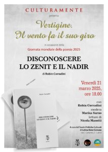 Proseguono gli incontri di Culturamente, organizzati dal Tavolo delle Politiche culturali di Latina Bene Comune. In occasione della Giornata mondiale della poesia 2025, il prossimo appuntamento è in programma venerdì 21 marzo alle 18, presso la sede Lbc di via Cattaneo 5 a Latina, e sarà dedicato alla poesia, con la presentazione di “Disconoscere lo zenit e il nadir” di Robin Corradini (Edizioni Botteghe Invisibili), seconda pubblicazione dell’autore.