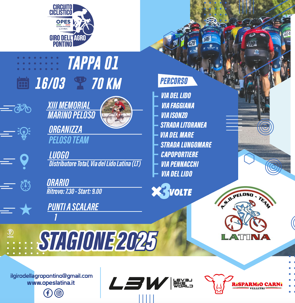 Sarà il XIII Memorial Marino Peloso ad inaugurare il Giro dell’Agro Pontino Opes 2025 domenica 16 marzo. Il Peloso Team è pronto per mandare in scena la prima tappa del circuito ciclistico che radunerà il gruppo a Latina.