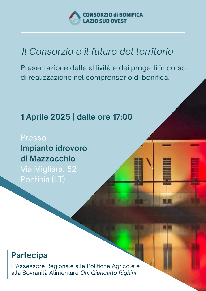 Domani, a partire dalle ore 17:00, presso l’impianto idrovoro di Mazzocchio, nel comune di Pontinia, si terrà l’evento dal titolo “Il Consorzio ed il futuro del territorio”. Un appuntamento di grande rilevanza per il territorio, volto a illustrare gli interventi e le innovazioni tecnologiche messe in campo per contrastare i cambiamenti climatici e la conseguente riduzione delle risorse idriche disponibili per l’irrigazione.