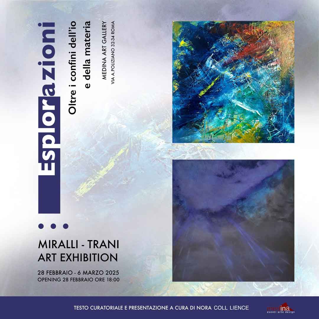 Si è inaugurata alla Galleria Medina Art, in via Angelo Poliziano a Roma, la mostra Esplorazioni oltre i confini dell’Io e della materia. In dialogo le opere di Antonio Miralli e di Alessandro Trani. Ma cosa hanno in comune questi due artisti così diversi e lontani per scelte tecniche e linguaggi espressivi? A legarli è il filo conduttore della ricerca che ha come denominatore comune il colore. Ora caldo e sensuale; ora lirico e contemplativo; ora lacerato e graffiato dalla materia. La mostra ci invita a un viaggio “tra gesto e sospensione, tra action painting e astrazione lirica“. Si legge nel comunicato di presentazione alla mostra: