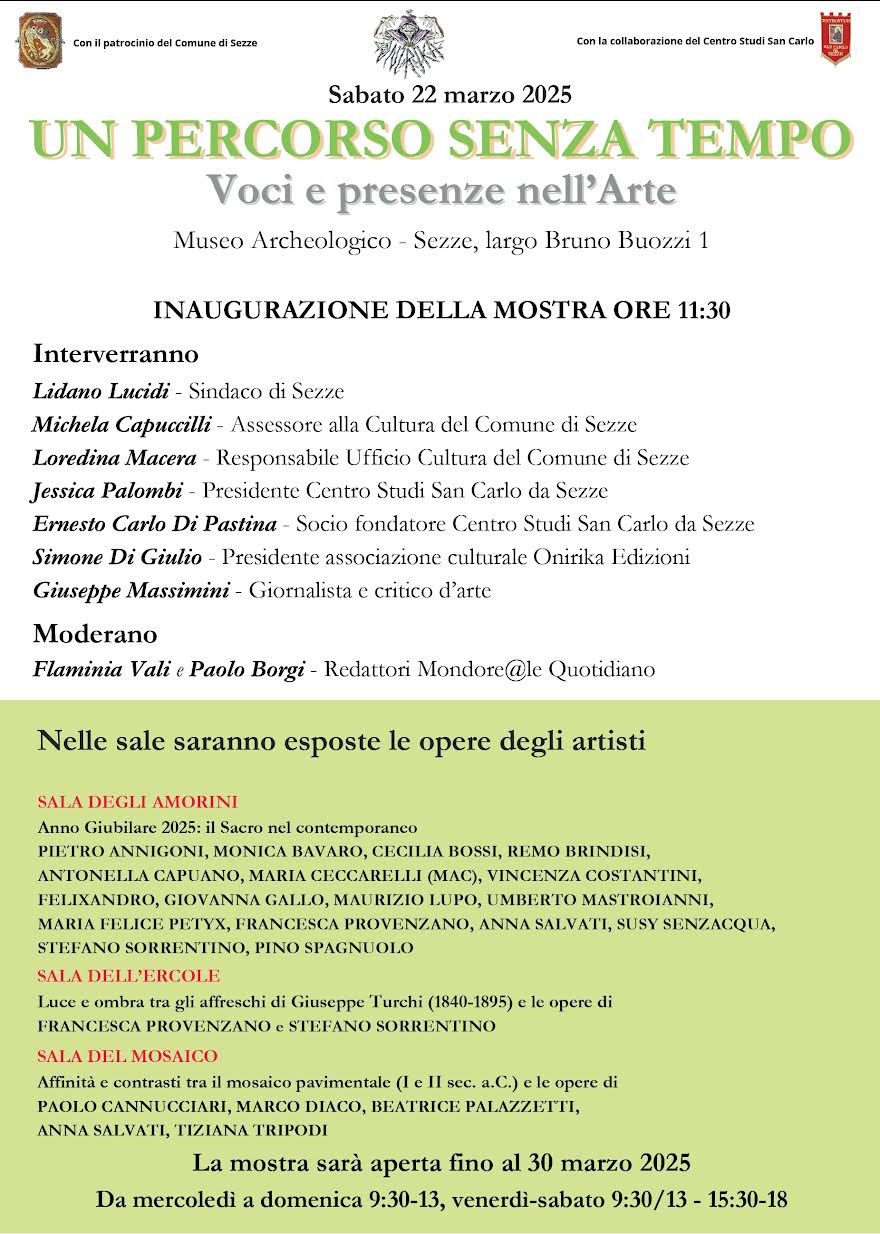 Sarà inaugurata sabato 22 marzo alle 11:30 presso Museo Archeologico di Sezze la mostra “Un percorso senza tempo. Voci e presenze nell’arte”. Articolata nelle tre sale del museo, la mostra è organizzata dall’associazione culturale Onirika Edizioni in collaborazione con il Centro Studi San Carlo da Sezze e con il patrocinio del Comune di Sezze. La sala degli Amorini, per celebrare l’anno giubilare, ospita la sezione “Il Sacro nel contemporaneo. Da una collezione privata”. Si inizia con le opere di quattro maestri storici, “voci” dell’arte italiana dei primi decenni del novecento, Pietro Annigoni, Remo Brindisi, Umberto Mastroianni e Luciano Minguzzi, quest’ultimo autore di una delle porte della Basilica di San Pietro e si prosegue con altre “presenze” del nostro panorama artistico. Pino Spagnuolo ci racconta la parabola del Figliol prodigo, una delle pagine del vangelo di Luca sul perdono e Cecilia Bossi omaggia San Carlo da Sezze. Antonella Capuano esalta il cammino della chiesa militante e Francesca Provenzano racchiude, in tre riquadri, degli avvenimenti della vita di Cristo.